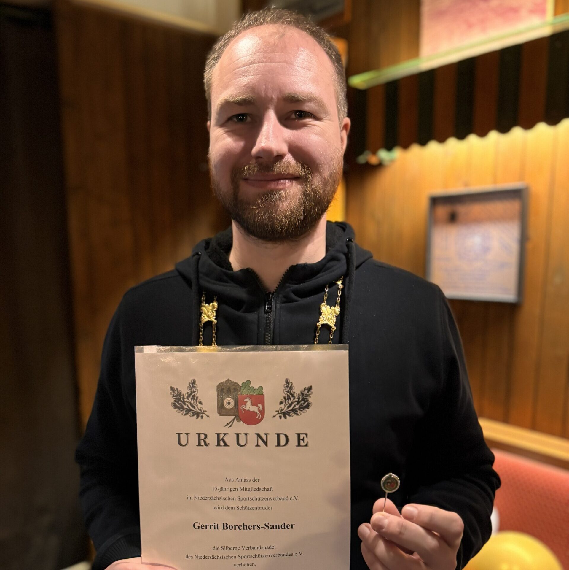 Zudem wurde Gerrit Borchers‑Sander mit der silbernen Verbandsnadel des NSSV ausgezeichnet – eine Anerkennung für 15 Jahre Mitgliedschaft und sein langjähriges Engagement.